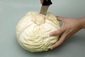 ขั้นตอนที่ 1 ใช้มีดควักตรงแกนกลางของกะหล่ำปลีดังรูป แต่ต้องระมัดระวังหน่อยนะ เฉือนเข้านิ้วขึ้นมาอดรับประทานแน่นอน