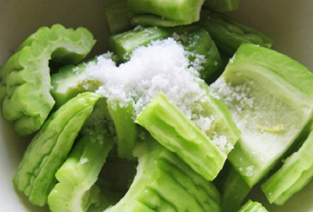 3 ขยำเกลือ ถ้าเกิดมะระขมมาก ให้พวกเราซอยบางๆและจากนั้นจึงนำไปขยำกับเกลือจนกระทั่งนุ่ม หรือนำแช่ลงในน้ำเกลือครู่หนึ่ง แล้วให้นำไปล้างน้ำออก 2-3 น้ำ เพื่อหายเค็ม แล้วต่อจากนั้นก็เลยนำไปปรุงอาหารต่อ